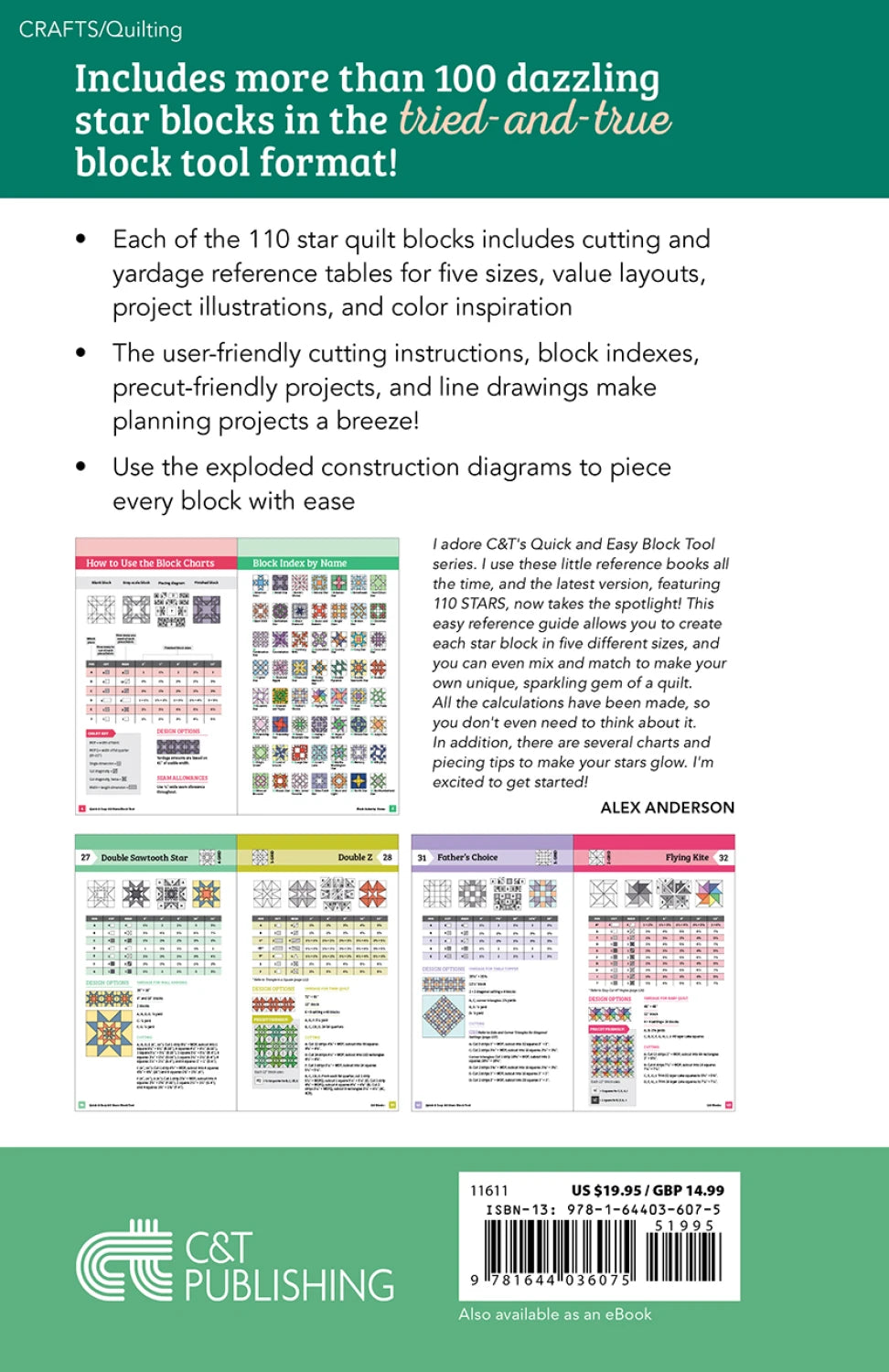 Each of the 110 star blocks in this no-math reference format comes with detailed tables, cutting instructions, exploded construction diagrams, project inspiration, and color examples.