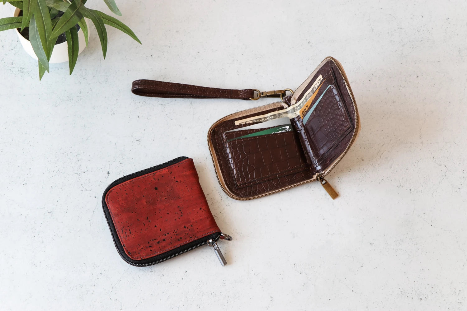 zipper closure, interior slip pockets, and optional belt loop