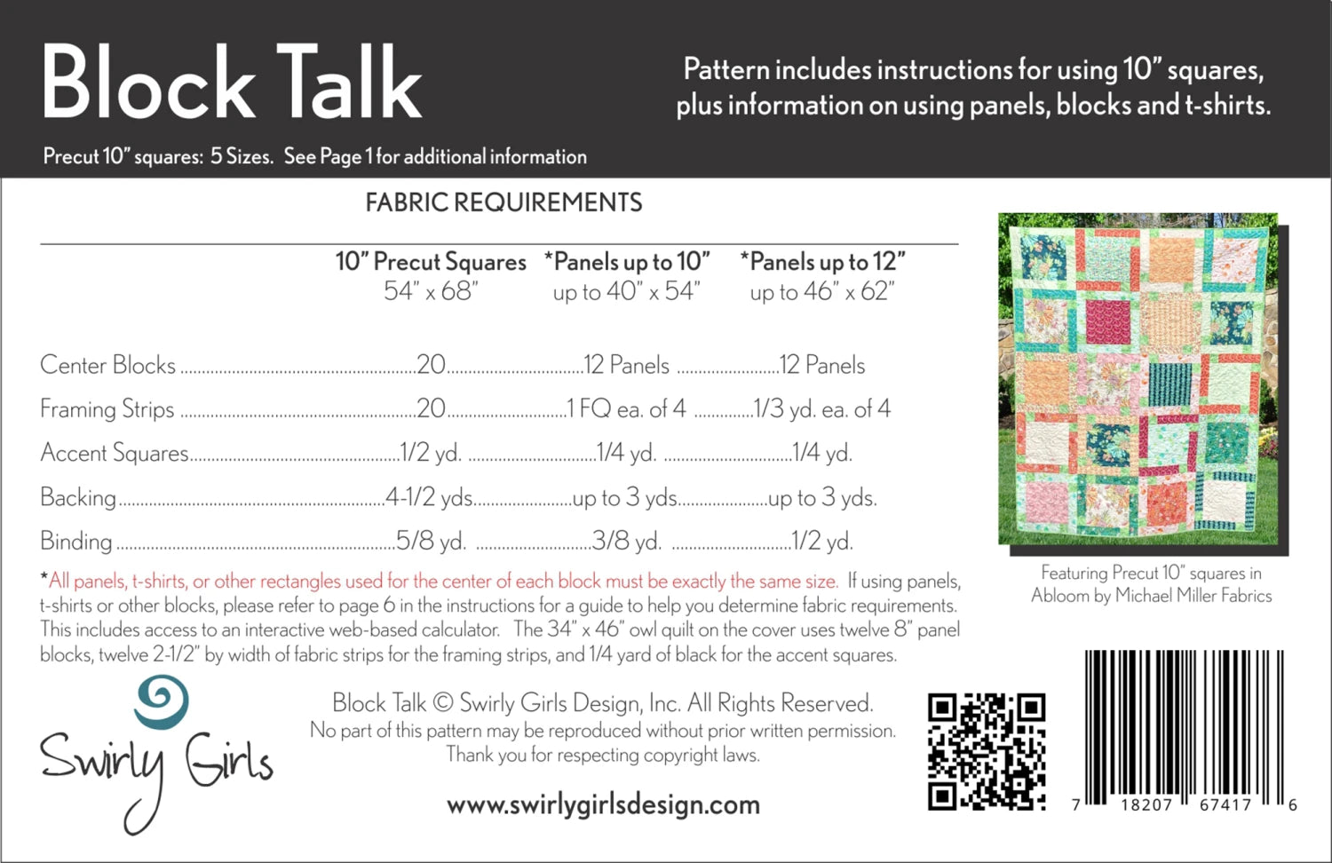 Very versatile pattern. Works for multiple panel and block sizes. Use forty 10" precut squares and an accent fabric, or use any same sized panels, t-shirts, or blocks with framing fabrics and an accent. Pattern is written using the 10" squares and panels. Bonus cutting instructions are included for panels, t-shirts, etc. Includes link to a web based interactive calculator to help you figure out how large your finished quilt will be, cutting sizes, and fabric requirements!