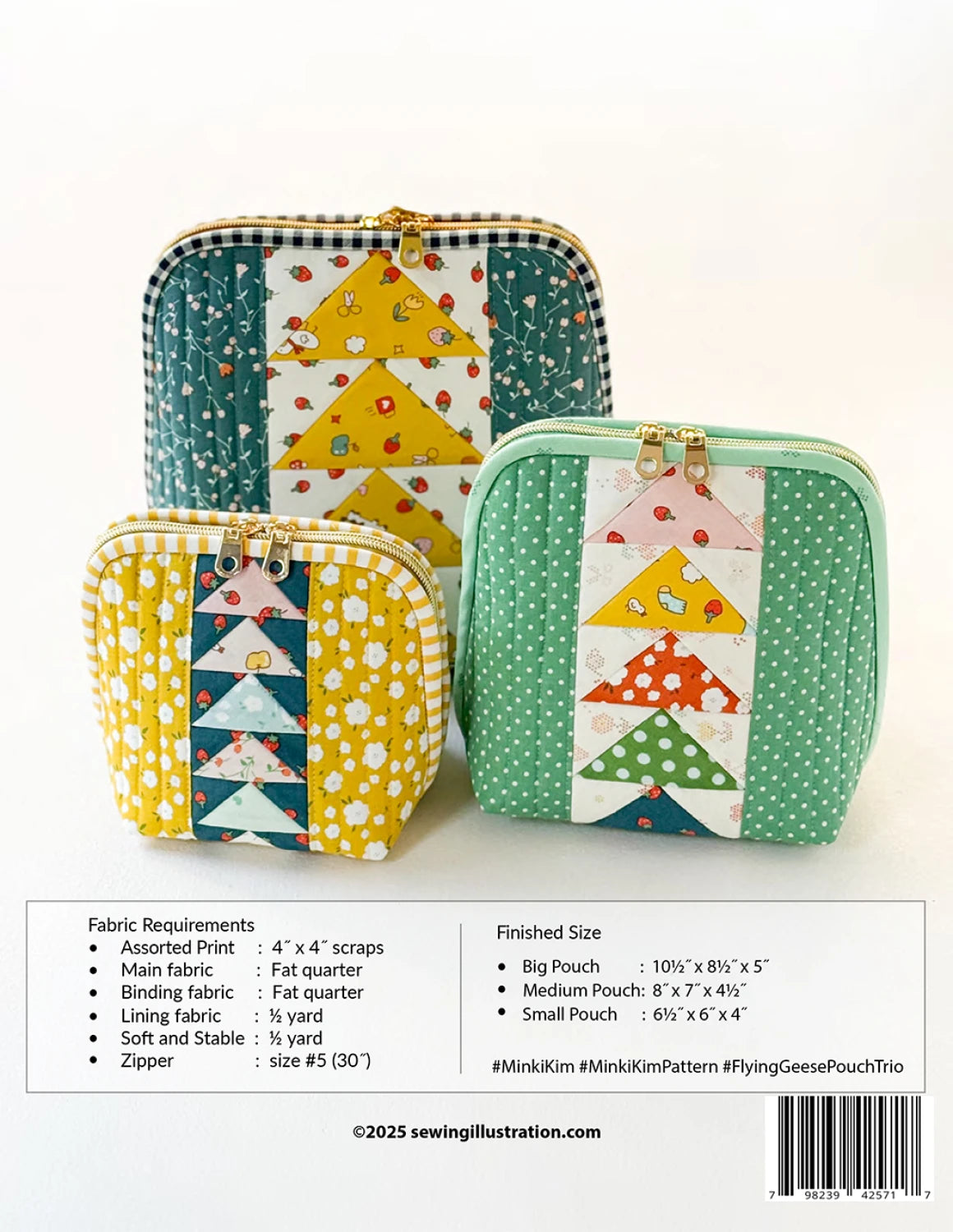 Make three stylish zipper pouches featuring the classic flying geese design! Perfect for storing sewing notions, makeup, or everyday essentials. With three different sizes, these pouches are as practical as they are pretty. A great scrap-friendly project to showcase your favorite fabrics! A full step-by-step video tutorial is included. Beautifully printed in a sturdy 8.5’’ x 11’’ hardcover format.