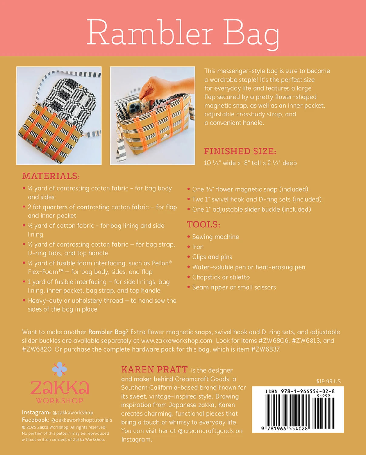 This messenger-style bag is sure to become a wardrobe staple! It’s the perfect size for everyday life and features a large flap secured by a pretty flower-shaped magnetic snap, as well as an inner pocket, adjustable crossbody strap, and a convenient handle. Includes instructions, full-size pattern sheet, two rose gold 1" swivel hooks and D-rings, one rose gold 1" adjustable slider buckle, and one rose gold 3/4" flower magnetic snap. Finished Size: 10 1/4" wide x 8" tall x 2 1/2" deep